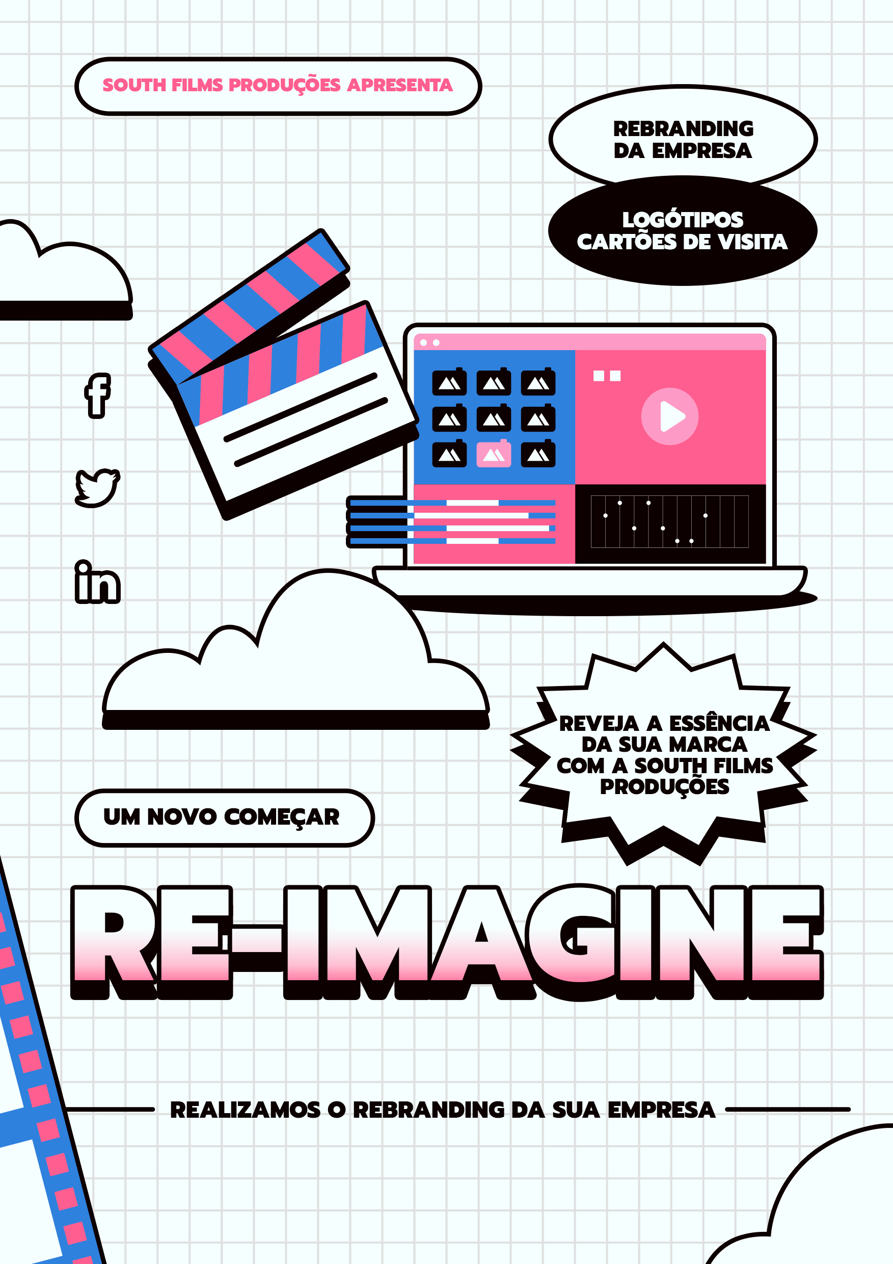 A South Films Produções cria a animação do seu logótipo, permitindo que ganhe vida, movimento, sendo uma alternativa moderna e sofisticada aos tradicionais logotipos estáticos.