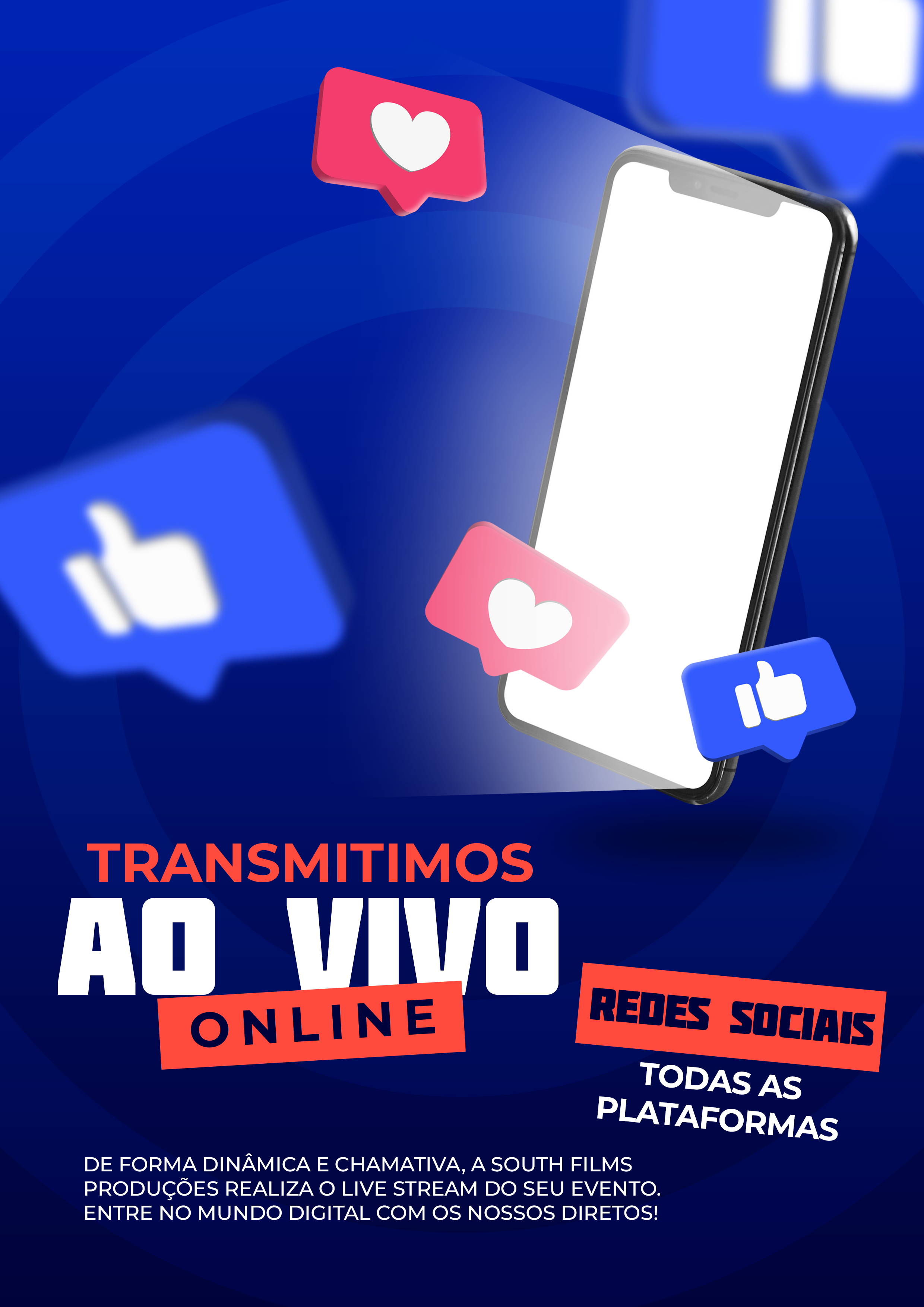 A south films produções fornece o serviço de transmissão para qualquer das redes sociais dos mais variados eventos, sendo elas transmissões contínuas de maior duração ou várias ligações de menor duração ao longo do dia.